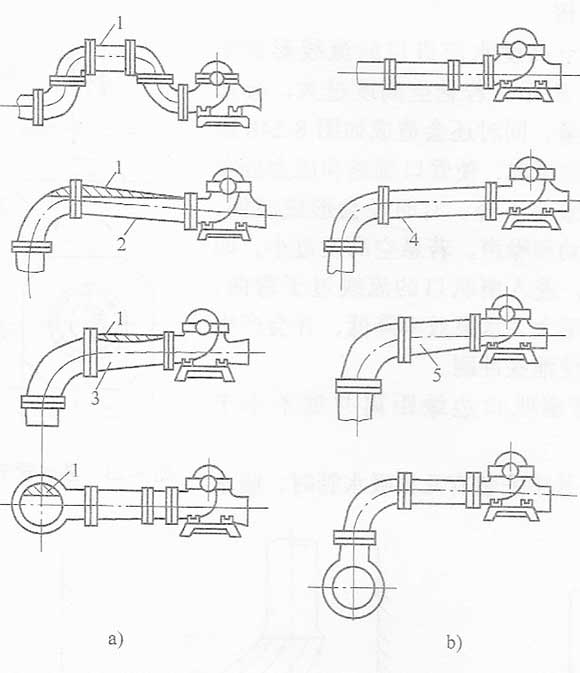 2、為保證吸水管不積氣,吸水管應(yīng)有沿水流方向連續(xù)上升的坡度一般大于0.005,為避免產(chǎn)生氣囊,應(yīng)使沿吸水管線的最高點(diǎn)在水泵吸入口的頂端。吸水管的斷面一般應(yīng)大于水泵吸入口的斷面,吸水管路上的變徑管可采用偏心漸縮管(即偏心大小頭),保持漸縮管的上邊水平,水泵進(jìn)口應(yīng)避免直接與彎頭相連,應(yīng)在二者之間加裝一段直管。正確和不正確的吸水管安裝圖所示為吸水管幾種正確和不正確的安裝方法。