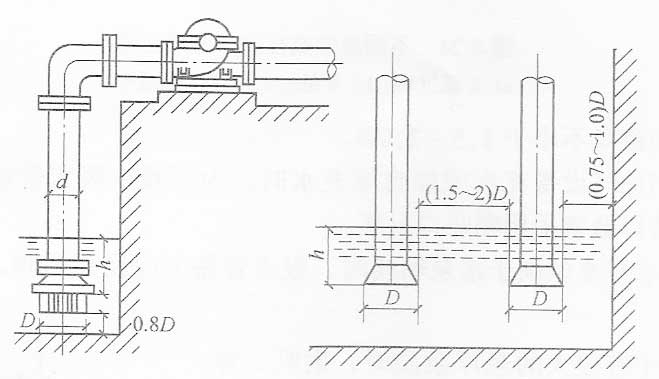3、不吸氣。吸水管進(jìn)口淹沒深度不夠時(shí),由于進(jìn)口處水流產(chǎn)生漩渦、吸水時(shí)帶進(jìn)大量空氣。嚴(yán)重時(shí)也將破壞泵正常吸水。這類情形,多見于取水泵房在河道枯水位情況下吸水。為了避免吸水井(池)水面產(chǎn)生漩渦,使水泵吸入空氣,吸水管進(jìn)口在最低水位下的淹沒深度h應(yīng)不小于0.5~1.0m,如吸水管在吸水井中的位置圖所示。